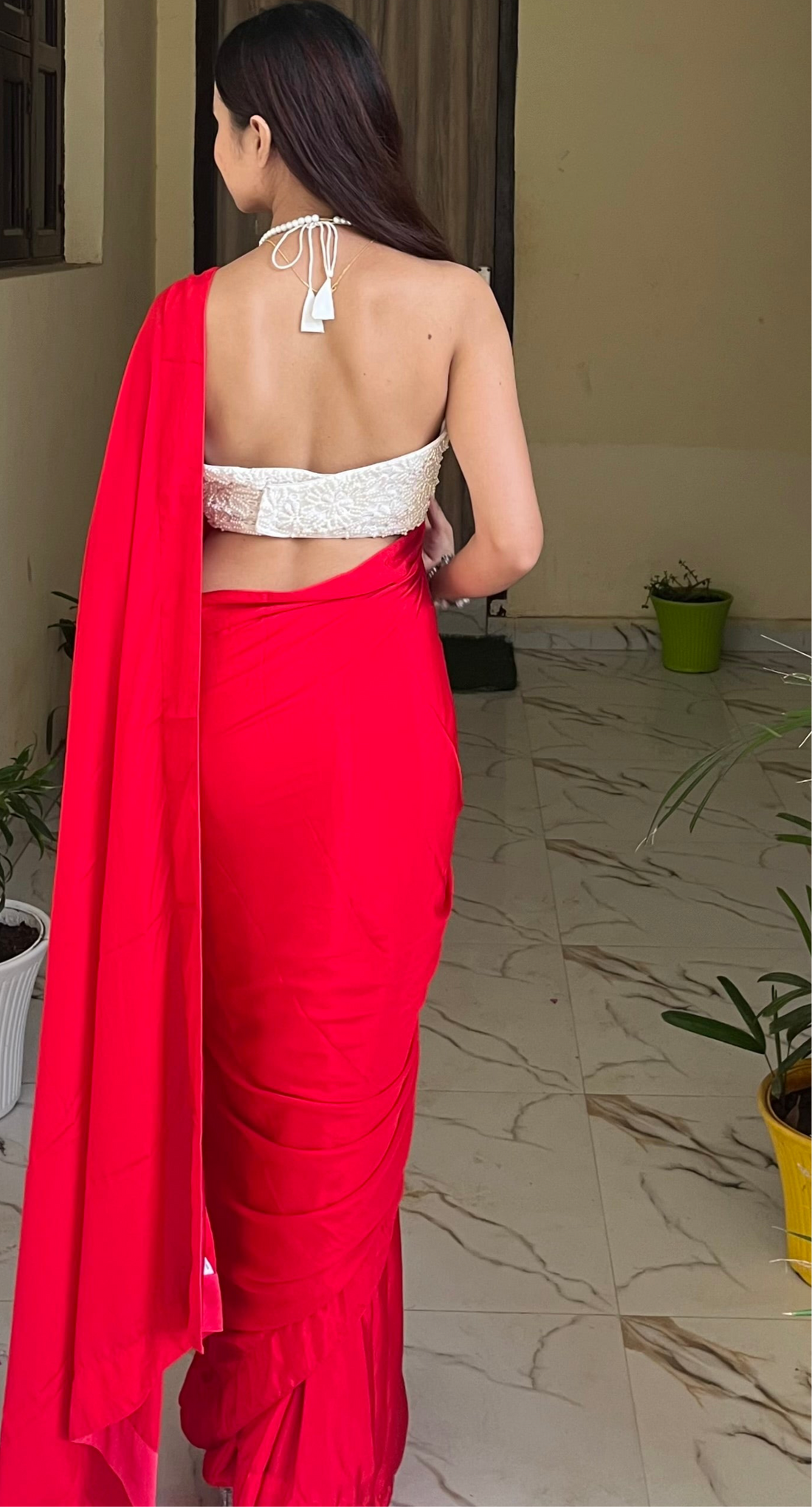 a. Pocket sareeb. Red pearl stitched blousec. Pre- stitched saree d. Petticoat Not Required