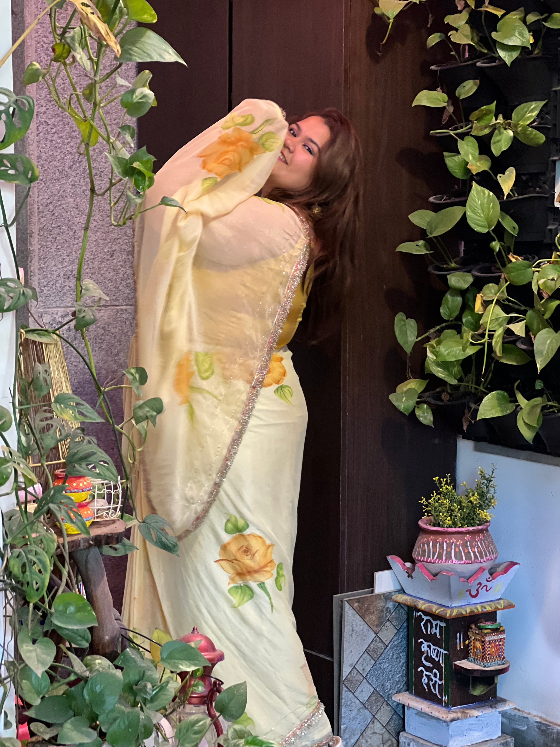 Introducing the hand painted saree with Border, a stunning pocket saree that comes with a pre-stitched blouse, eliminating the hassle of finding the perfect match. Made from high-quality Chiffon, this saree exudes elegance and charm. The pre-stitched feature makes it easy to wear and ensures a flawless drape every time, with no need for a petticoat. This gorgeous piece is perfect for special occasions, weddings, or formal events, and will surely make you stand out in the crowd. Embrace the timeless beauty and grace of the hand painted saree With Border saree.
